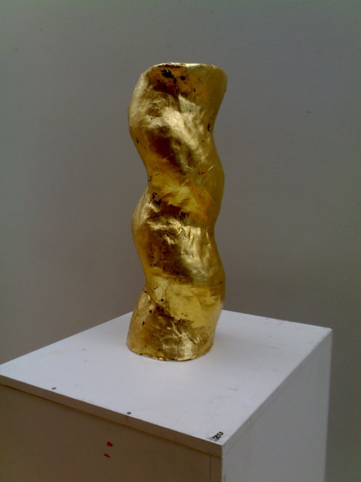 31012008 Savesta muovailtu pienoismalli, josta kipsimuotti ja siihen laminoitu paperi, pinnalla lyöntimetallia.